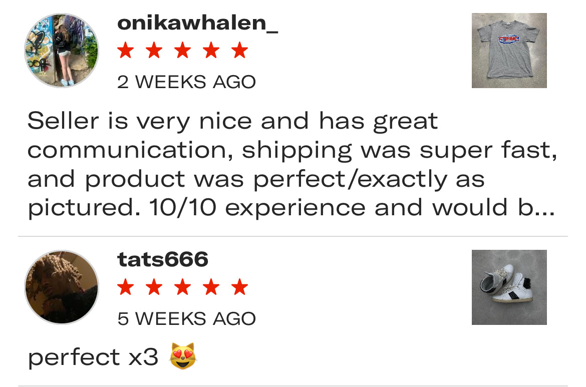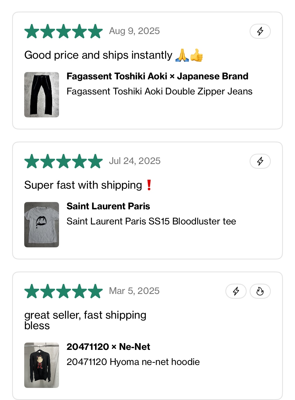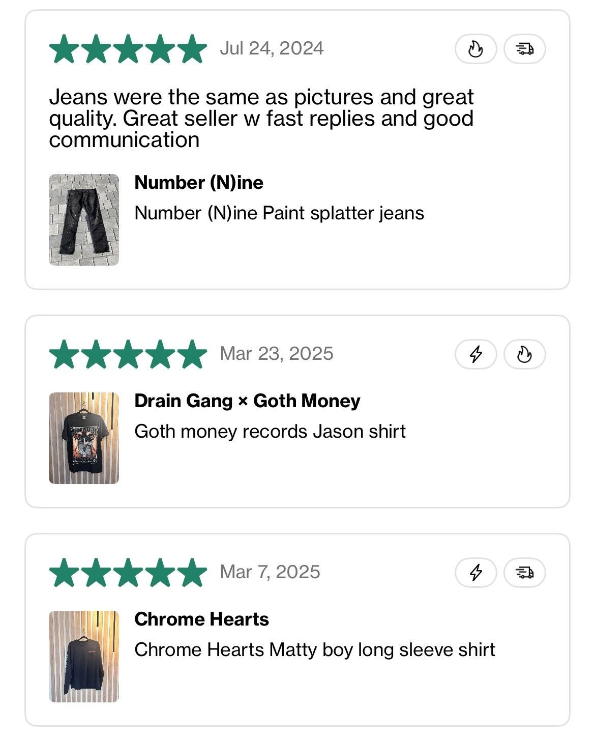Depop was the first platform where I began selling from my own closet before moving into vintage and archive pieces. Over time, I built a trusted presence and consistently maintained high ratings, reflecting my focus on authenticity, quick shipping, and buyer satisfaction.