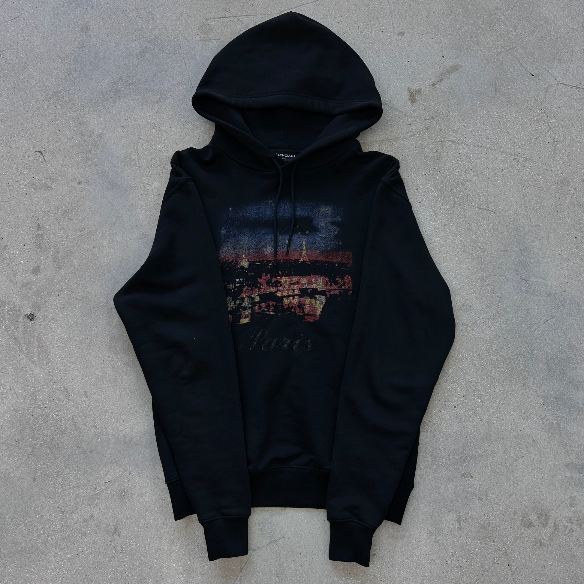 Personal piece but looking to get something else. Very nice comfy hoodie. Paris print is a bit faded but rest of hoodie is in great condition. Chest and hem size is about a medium and sleeves fit tight but wearable for a size S.